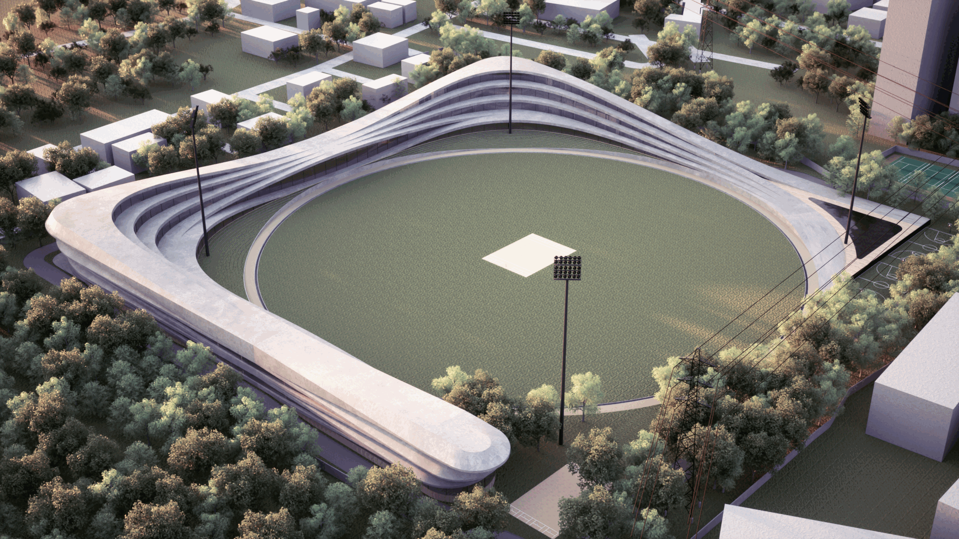 The building’s narrow massing is wrapped in a fluid, sinuous skin that elegantly integrates the staggered volumes of the structure. This cohesive design not only unifies the diverse programs but also fosters a sense of energy and motion, resonating with the dynamic nature of cricket.