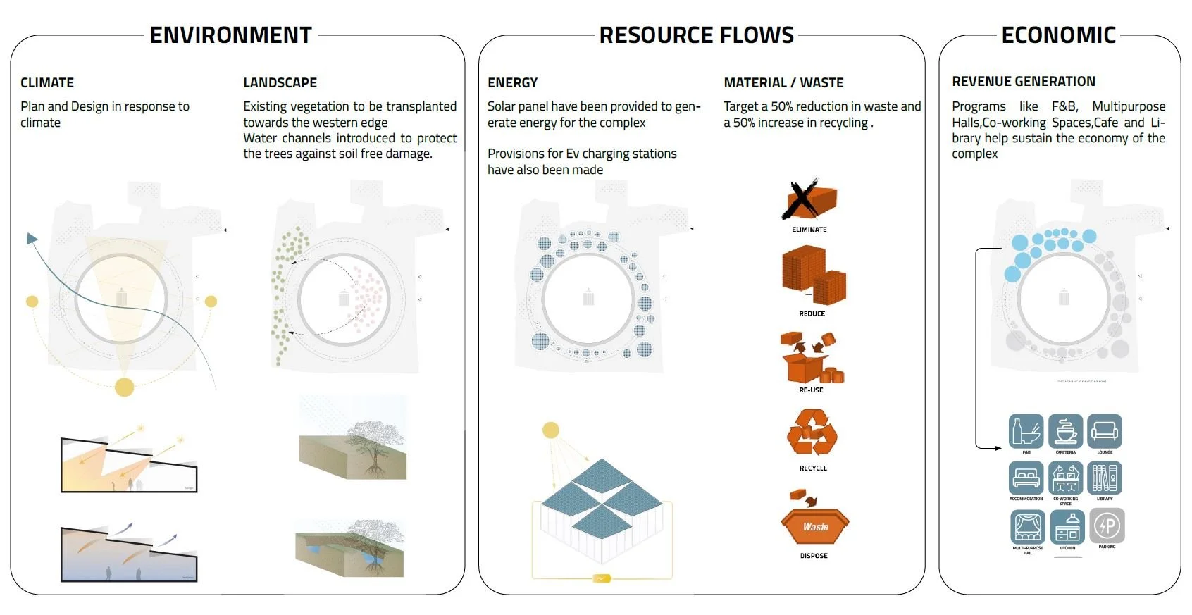 The High-Performance Centre is designed to address the multifaceted needs of the CSK cricket team, encompassing training, accommodation, and public relations. At its core is a 91-meter-diameter pitch that serves as the centerpiece, organizing and anchoring the surrounding programs. This central element reflects tVhe essence of the team’s identity and purpose.